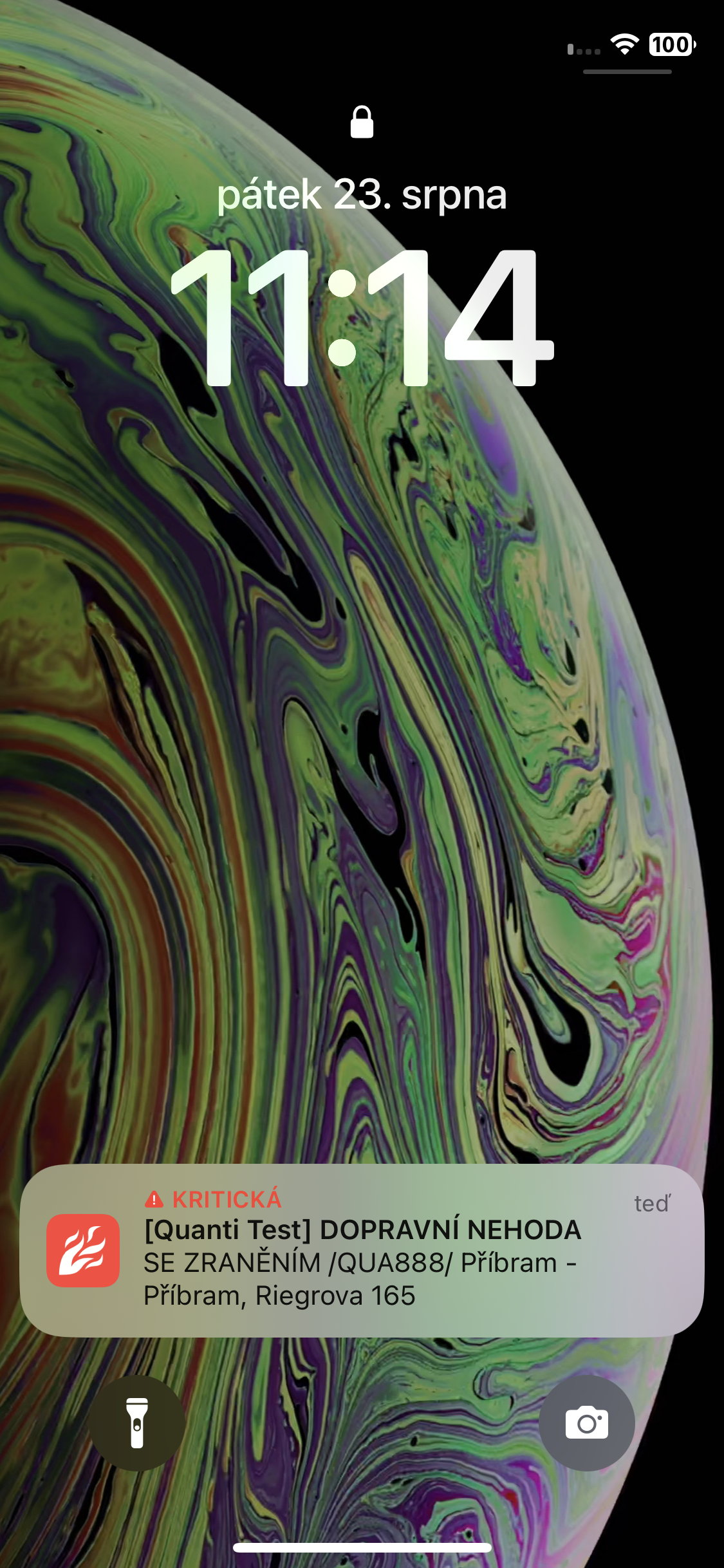 U zavřené aplikace, nebo jinde než na úvodní obrazovce, se při vyhlášené události zobrazí push notifikace včetně přehrání zvuku upozornění.