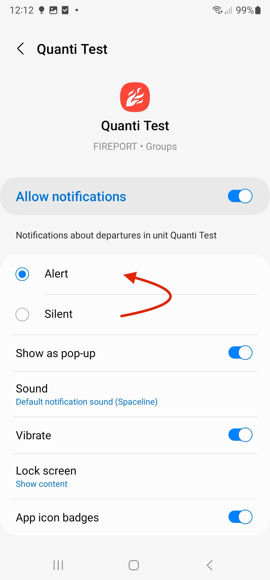 Mobilní telefony Samsung v Android 10 omezují aplikaci FIREPORT ve vyzvánění při ztlumeném telefonu. Proveďte následující nastavení podle obrázku a v aplikaci FIREPORT poté vypněte a znovu zapněte volbu "Obejít nastavení tichého režimu".