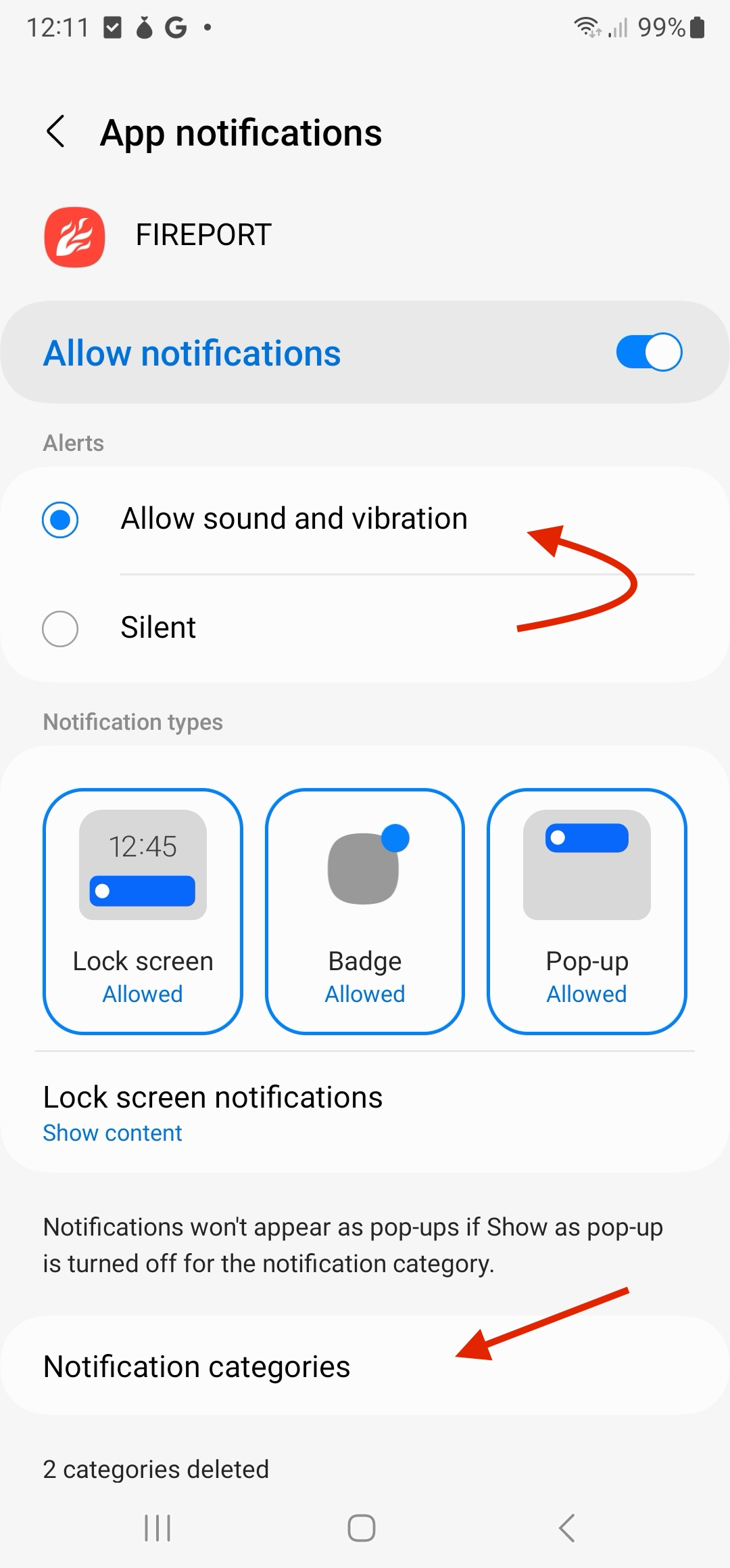 Ujistěte se, že v nastavení oznámení pro aplikaci FIREPORT je zapnutá možnost Povolit zvuk a vibrace a že není nastaven tichý režim oznámení. Dále přejděte do sekce Kategorie oznámení, kde je možné nastavit zvukové preference pro jednotlivé skupiny. Pro každou skupinu zkontrolujte, že není zvolena možnost Tiché oznámení, ale že jsou povoleny zvukové a vibrační notifikace. Tento postup opakujte pro všechny skupiny, pokud jich je více.