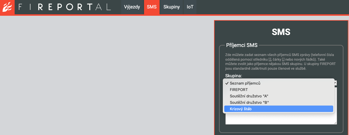 Při psaní zprávy do skupiny FIREPORT dostanete nabídku: Poslat z výjezdové SMS brány