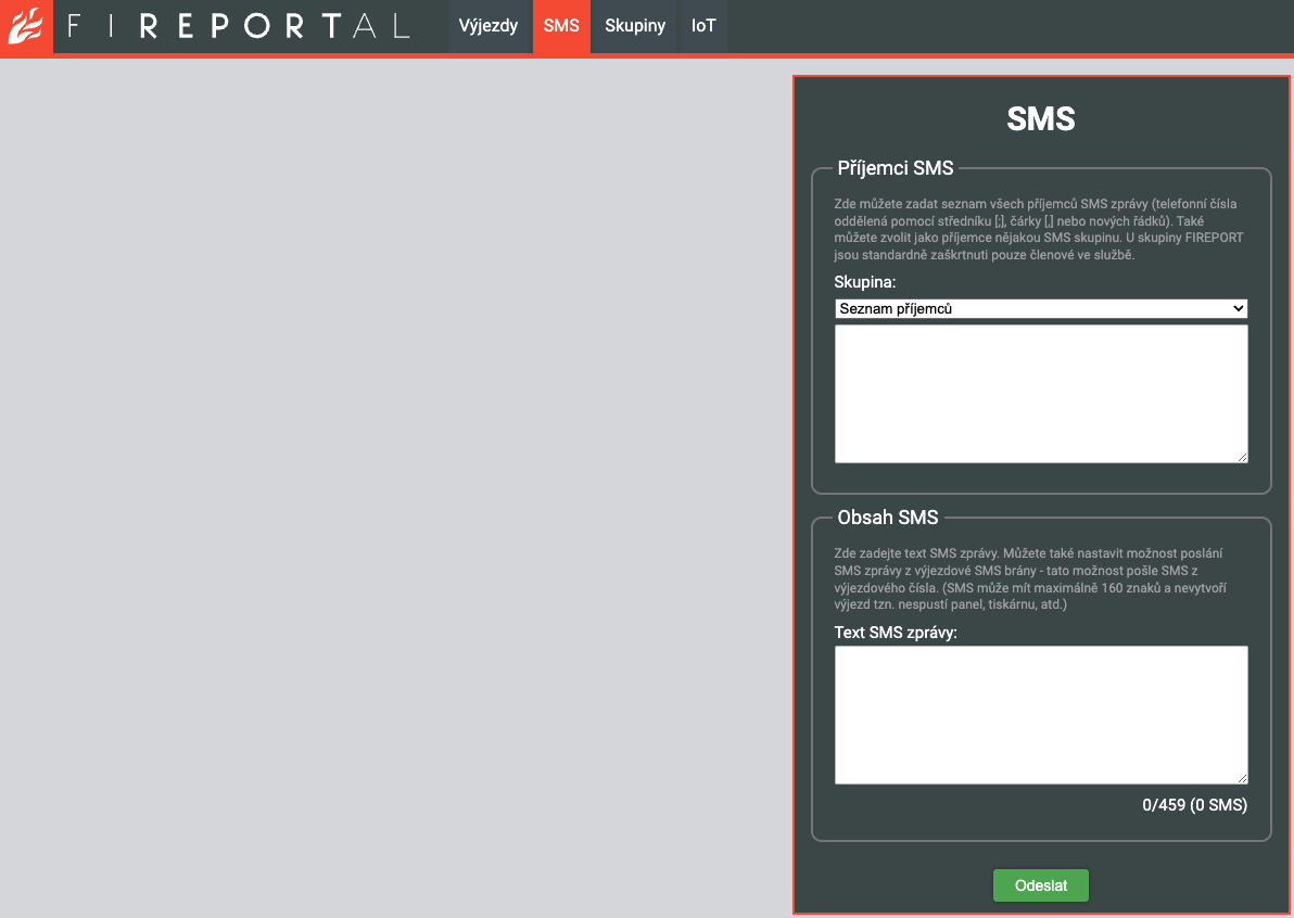 V záložce SMS lze odeslat SMS členům výjezdové jednotky, nebo dalším skupinám příjemců, které si můžete libovolně vytvořit. Informativní SMS může být dlouhá až 459 znaků.