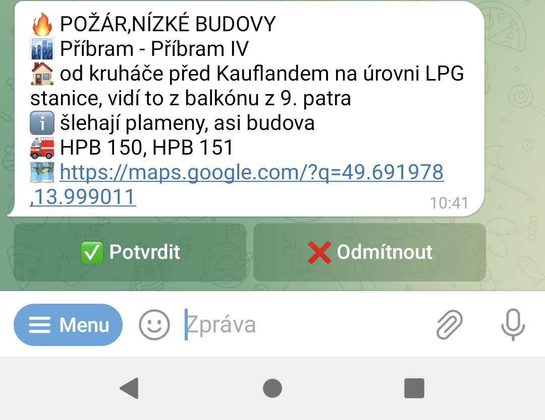 Níže přikládáme potenciální vzor zprávy, která přijde hasiči při poplachu.
